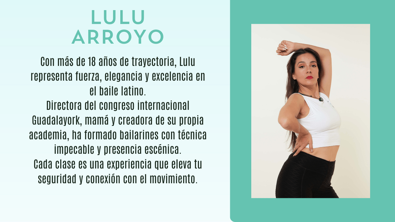 Con más de 18 años de trayectoria, Lulu representa fuerza, elegancia y excelencia en el baile latino.